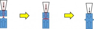Instead of physical contact (as in hot plate welding), the two part surfaces are heated and melted with infrared (IR) contactless heat radiation. After the IR radiator is pulled out, the two parts are pressed together.